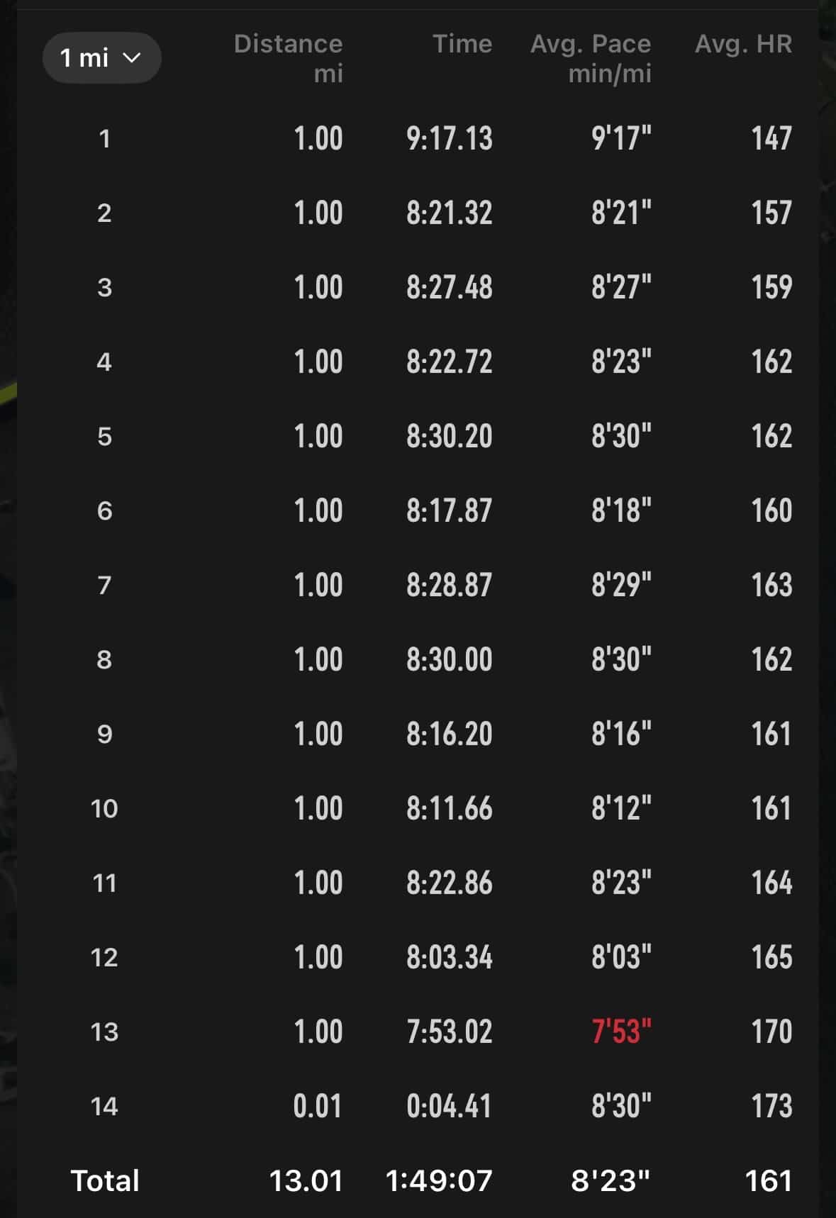 You handled it really well though. Settling in by mile 6 and then finishing with negative splits on that course is seriously solid. And 1:49 on tired legs, with that start, is more than decent!