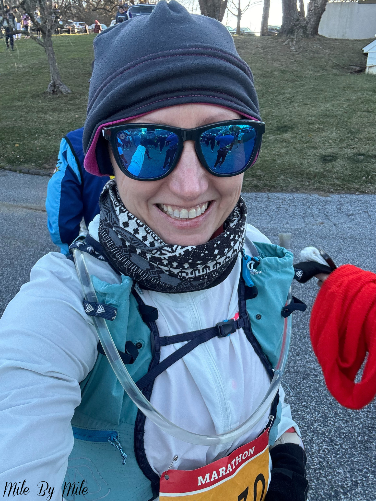 As I was checking the forecast I saw that it was supposed to be in the 20s and windy throughout most of the race. The real feel at the start was in the teens. I had to make some last minute switches to my race outfit and I hoped it would work out since I hadn’t worn winter running clothes in a long time!