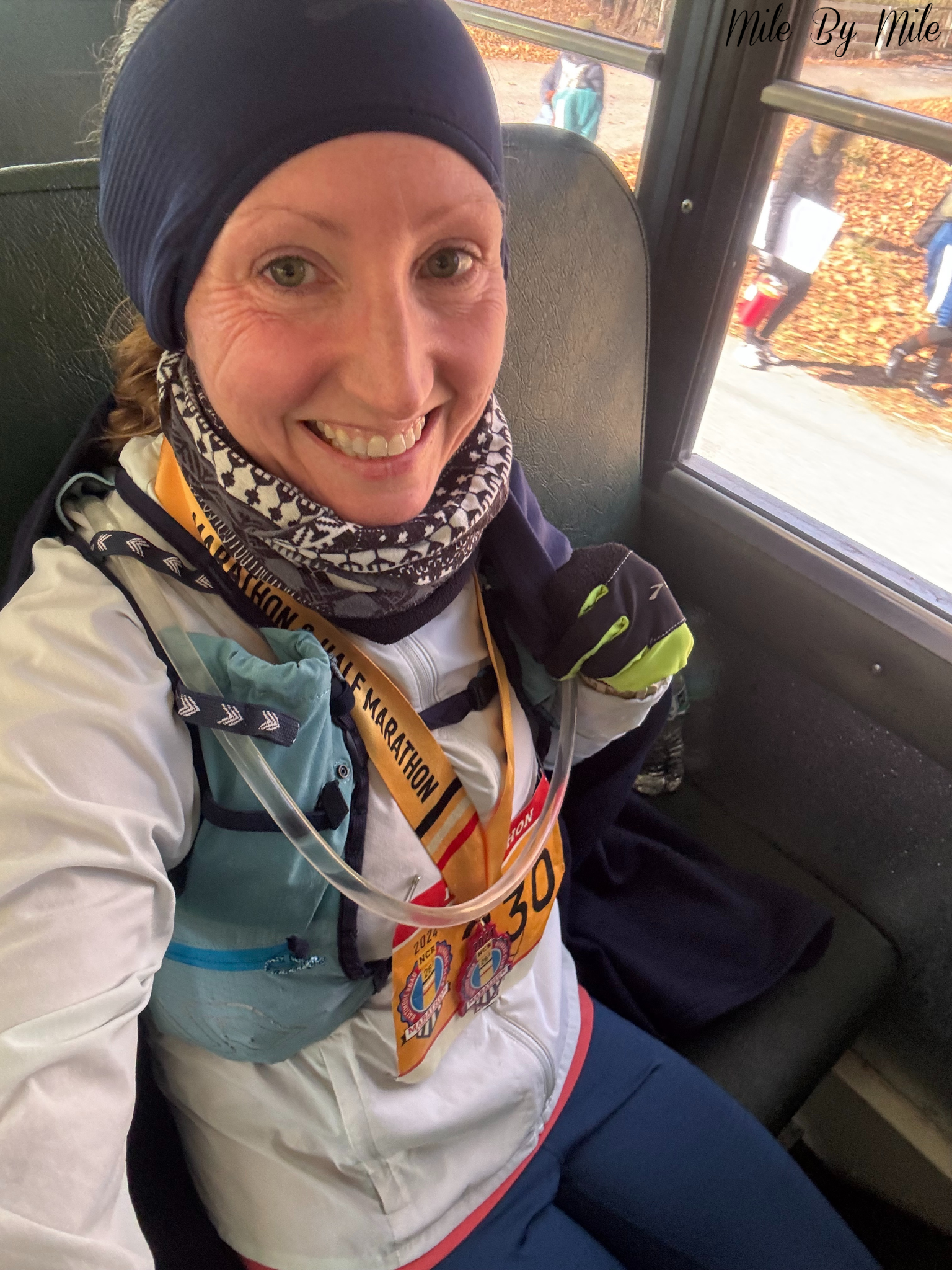 It was so cold waiting for the bus but it came quickly. I wore some extra clothes that I put in my bag and checked before the start. I figured it would be good to have them after I finished too.