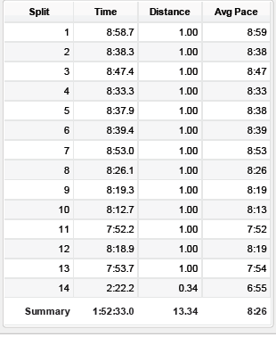 When I started the race I had some trouble settling into a good pace. Everyone around me seemed to go out faster than me(I think I was in the 1:55 corral) and my first mile was just under a 9:00/mile pace. After that first mile I fell into a good pace and stayed around 8:40 for awhile (except the mile with the insane hill!!) Around mile 9 I was feeling good and decided to gradually speed up for the rest of the race.