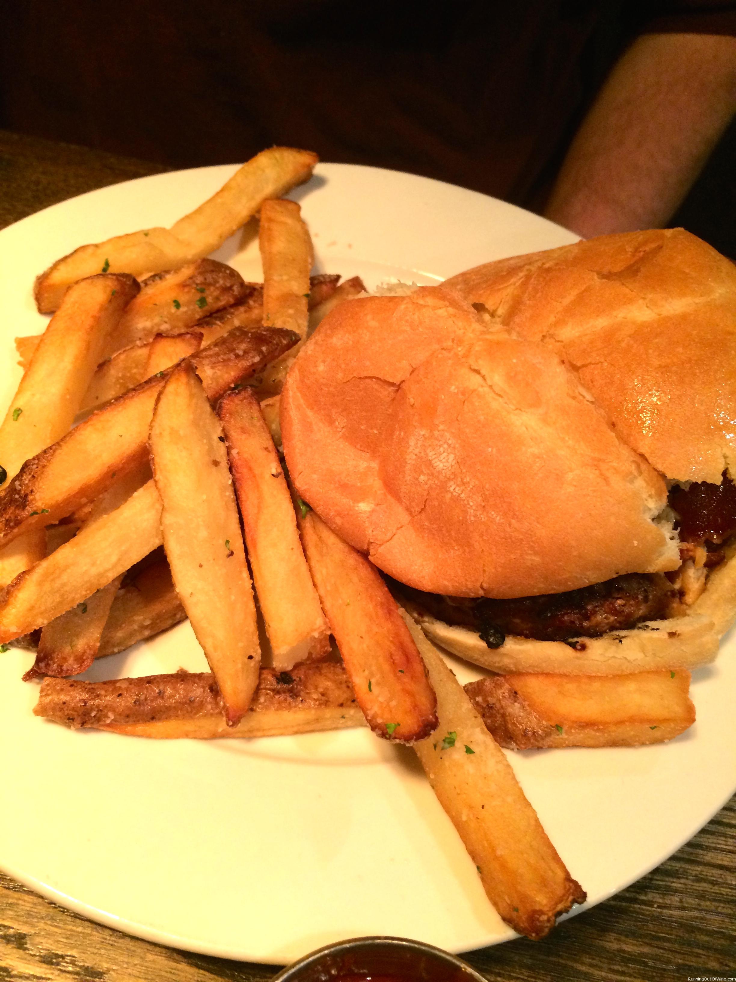Rob got a burger with pulled pork and bacon it. Yes that included a beef burger, pulled pork AND bacon in one sandwich. It was pretty ridiculous but you can’t even tell from the picture.